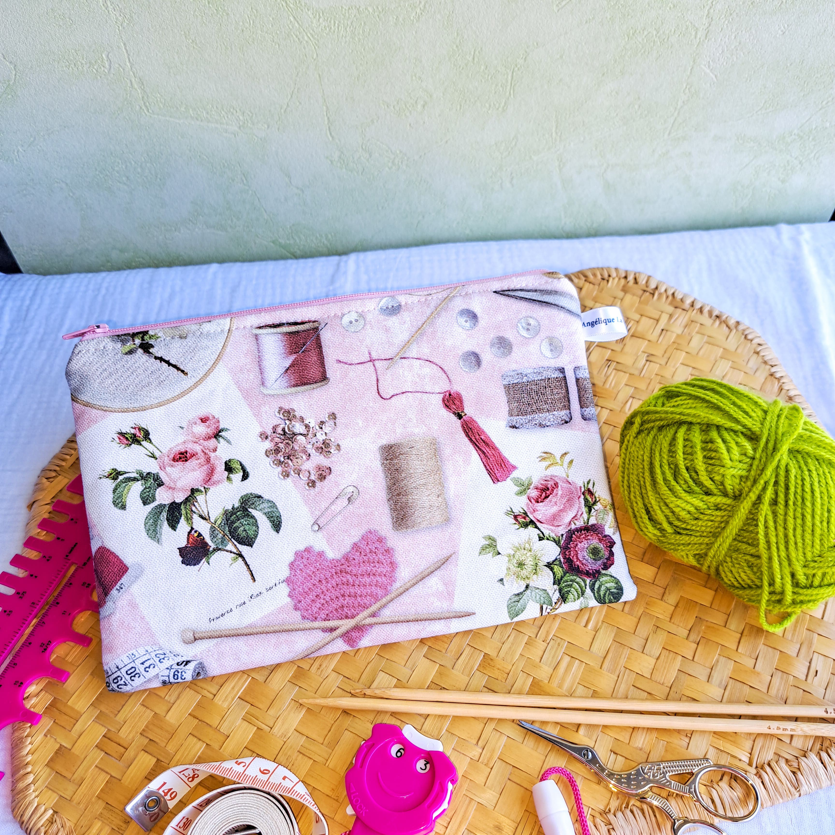 Laissez-vous charmer par la Trousse Zippée "Vintage Pastel" d'Angélique La Fée En Fil, une création artisanale qui apporte une ambiance douce et nostalgique à votre atelier. Son motif est un hommage à la mercerie classique et délicate : on y trouve des roses anciennes, des bobines de fil aux couleurs pâles, des boutons discrets, et même un nuancier de fils à broder ! La palette est dominée par les pastels et le rose poudré sur un fond neutre, créant une atmosphère apaisante, idéale pour la concentration.