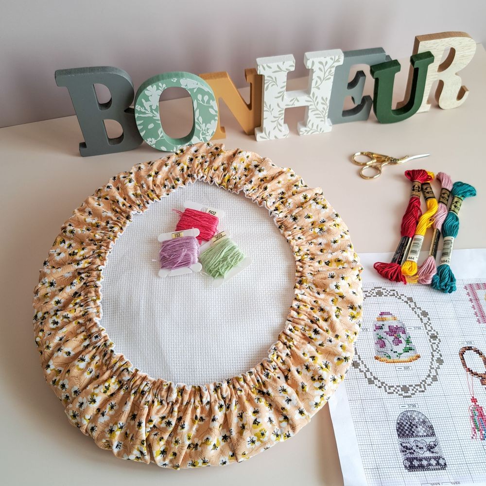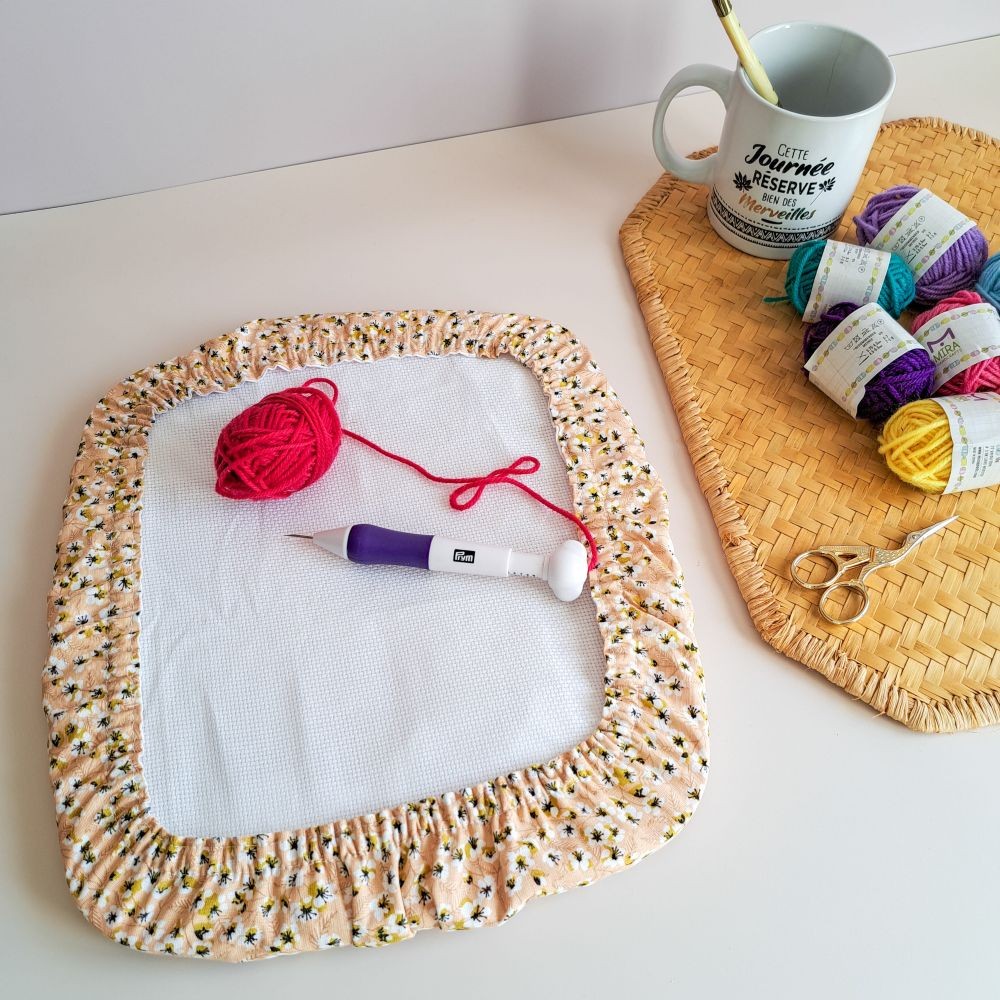 - Entièrement élastiqué pour bien se maintenir au cadre à broder