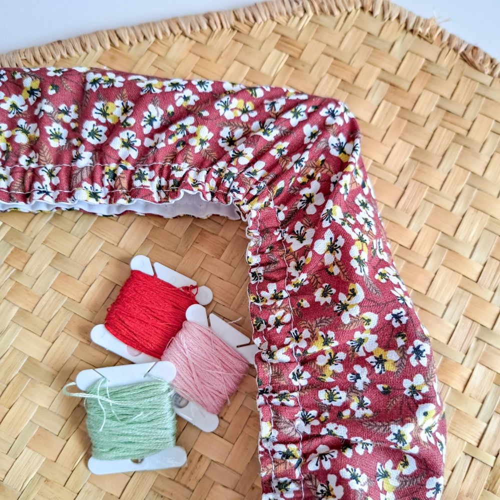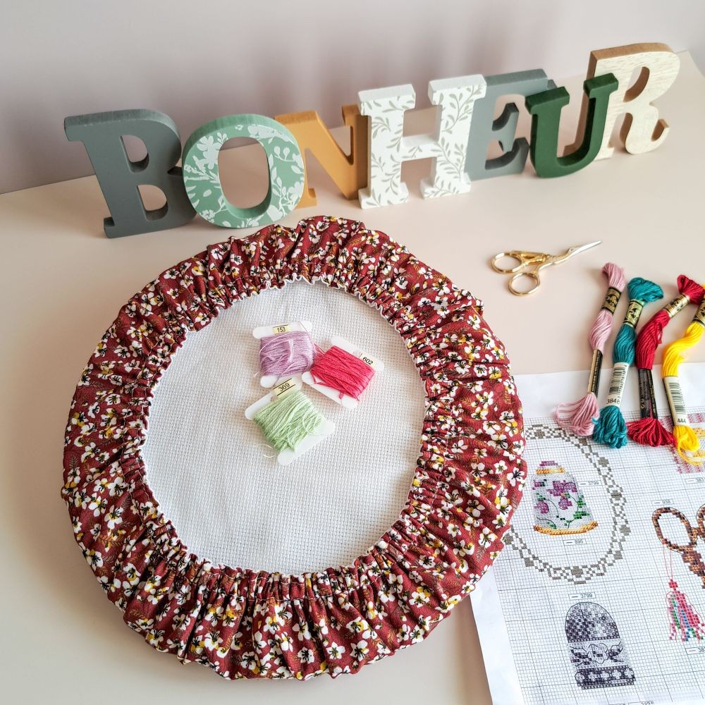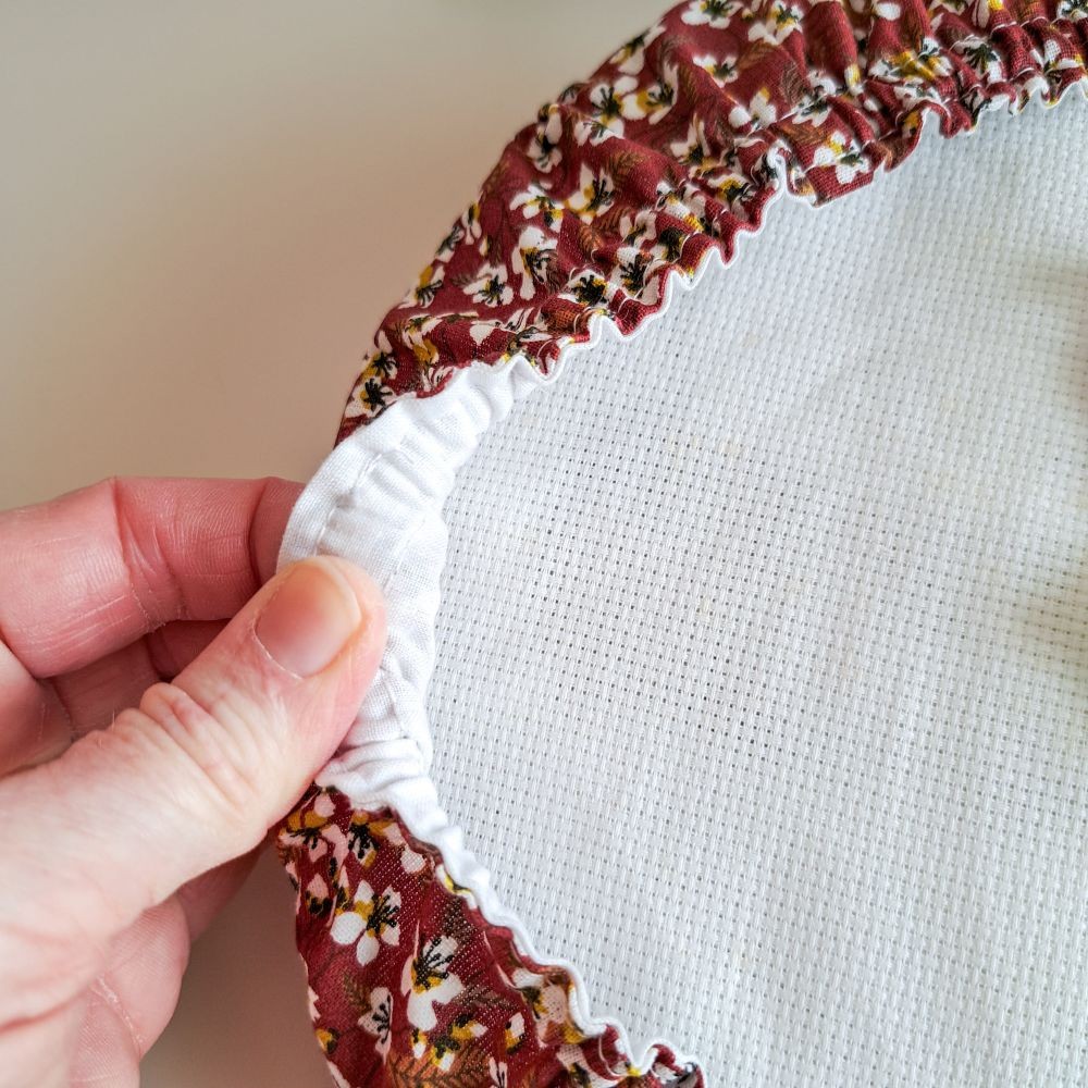 Vous pourrez y mettre le surplus de toile à broder à l'interieur du tissus élastiqué pour vous faciliter le passage de l'aiguille sous votre projet et éviter également les salissures.