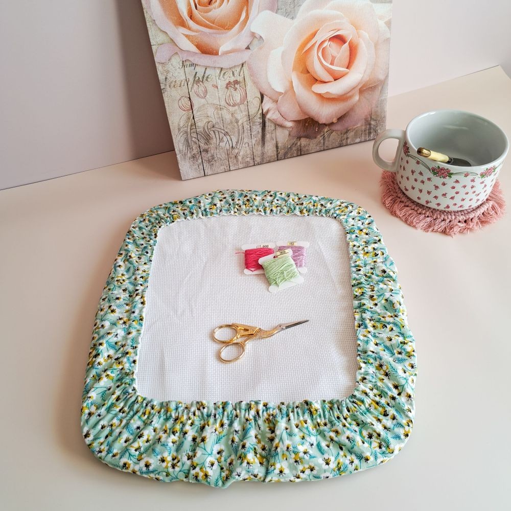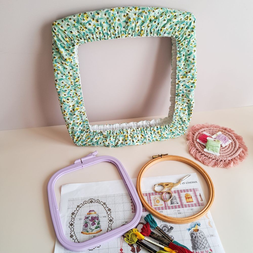 Glissez simplement l'élastique autour de votre support, rangez-y votre surplus de toile, et brodez l'esprit léger. Une touche de fantaisie et beaucoup de praticité pour toutes les fées du fil !