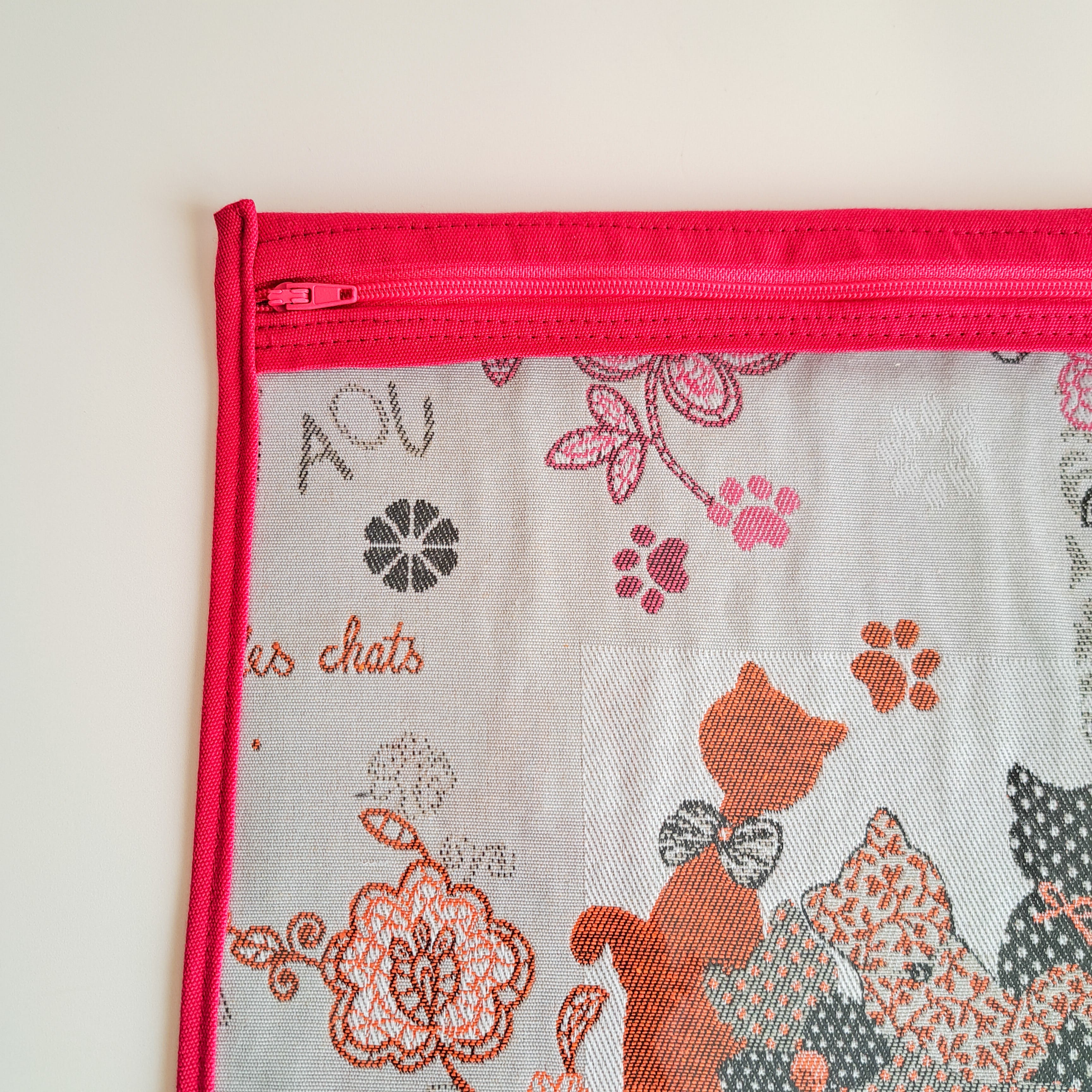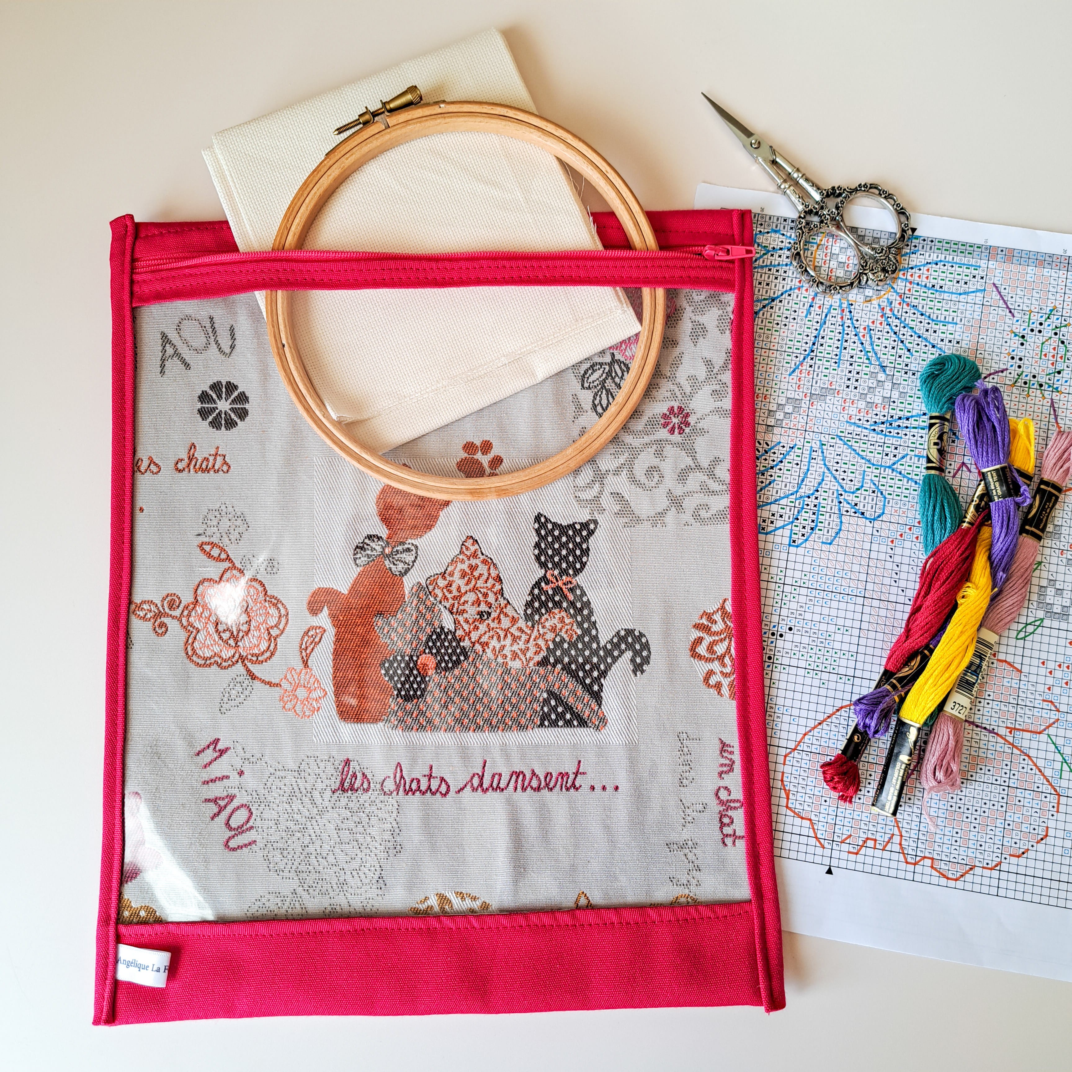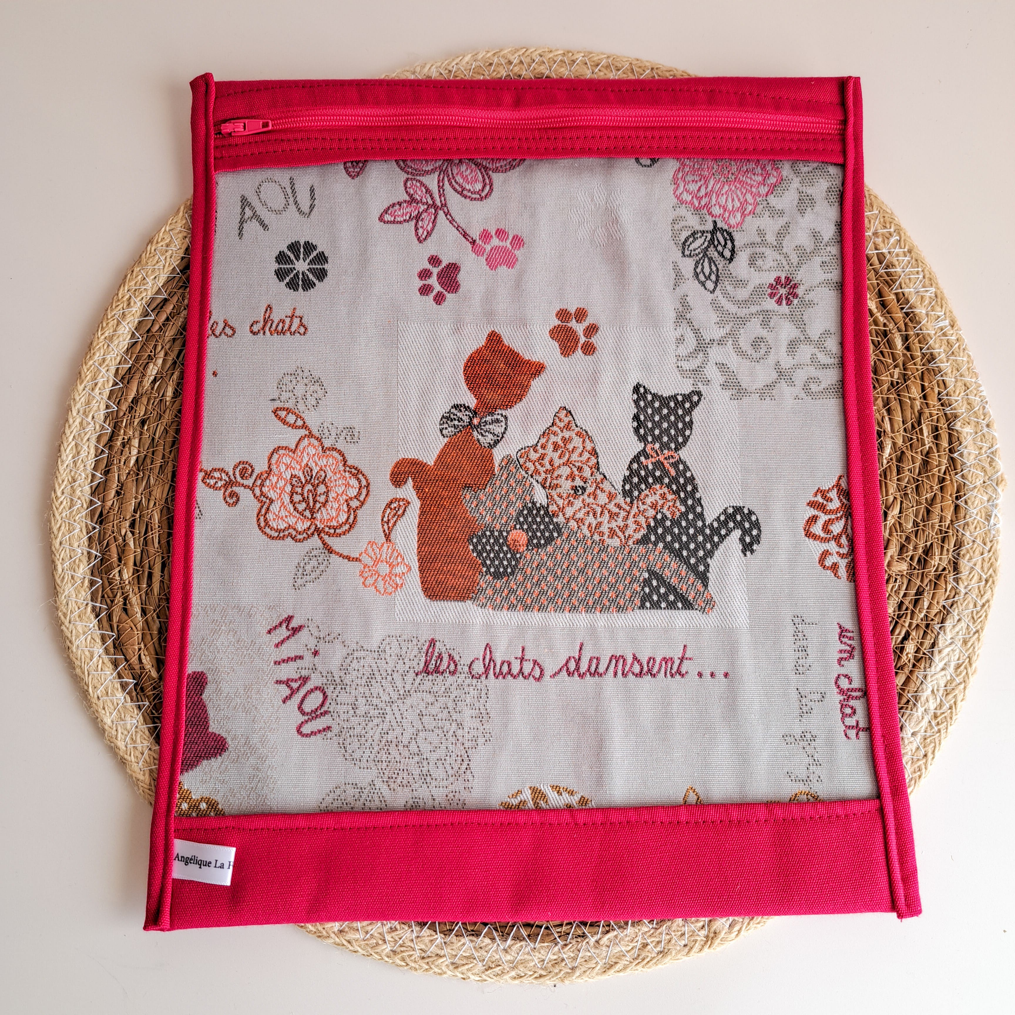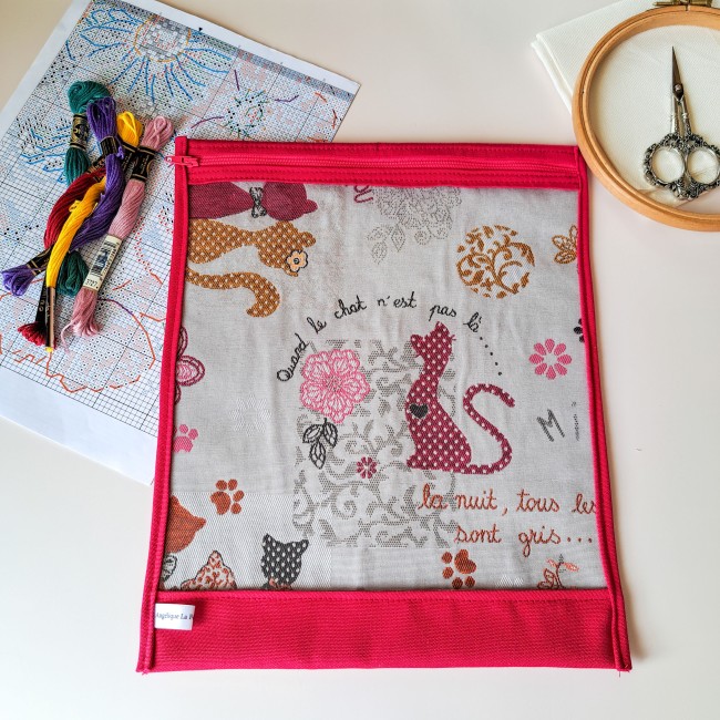 Apportez du charme à votre loisirs préféré avec ce sac à projet motif chat et son enveloppe rose fushia !